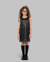 SLEEVELESS DRESS MADE OF FAUX LEATHER WITH A ROUND NECKLINE. STRAIGHT-CUT SILHOUETTE FEATURING A FRONT CENTRAL SEAM AND DECORATIVE BOW APPLIQUÉS ON THE SIDES. KIDS’ MIDI LENGTH WITH A SMOOTH FINISH FOR A MODERN, EDGY LOOK. PERFECT FOR STYLING WITH BOOTS OR LAYERED PIECES.